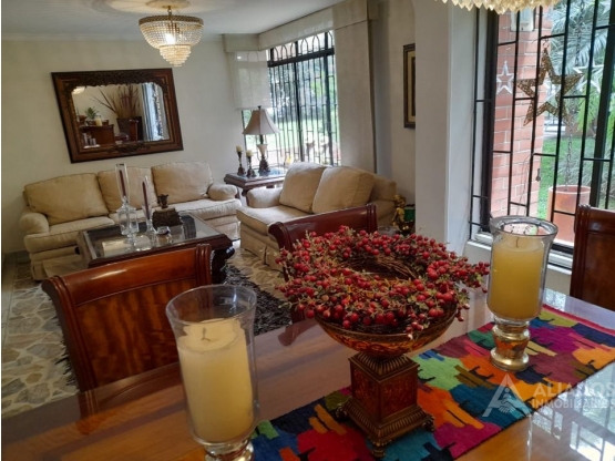 Sala y comedor, cocina integral, zona de ropas independiente, alcoba de servicio con baño, baño auxiliar, cuarto útil y parqueadero para 4 carros en línea . Patio con fuente de agua y jardín circundante