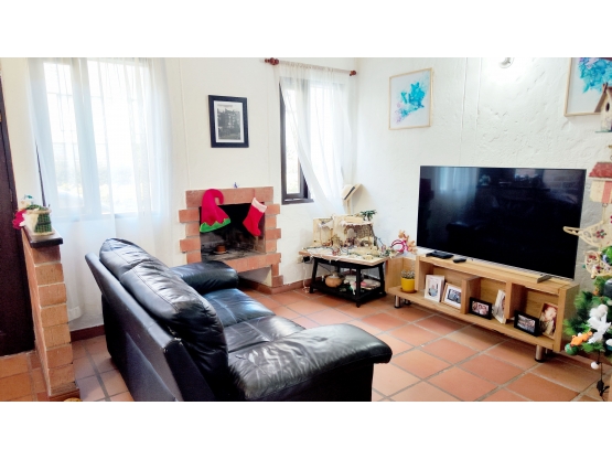 Sala con chimenea, comedor, cocina semi integral, zona de ropas, patio, garaje y baño social.